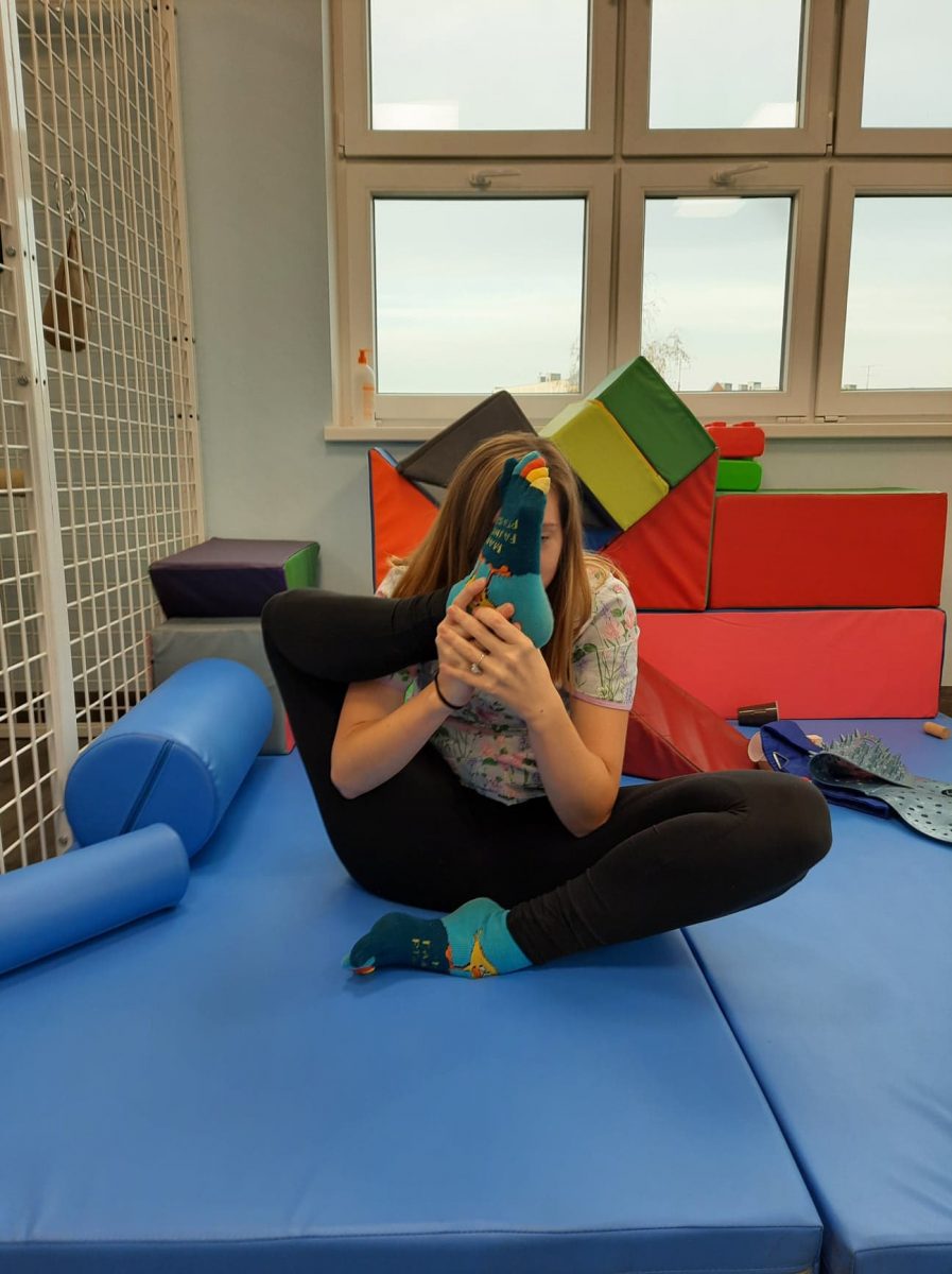 - Siad ugięty z kolanami rozchylonymi na zewnątrz pomiędzy stopy wkładamy dziecku mały ręcznik możemy podeprzeć się rękoma za plecami i staramy się unosić nogi jednocześnie wyrzucając stopami ręcznik przed siebie.